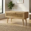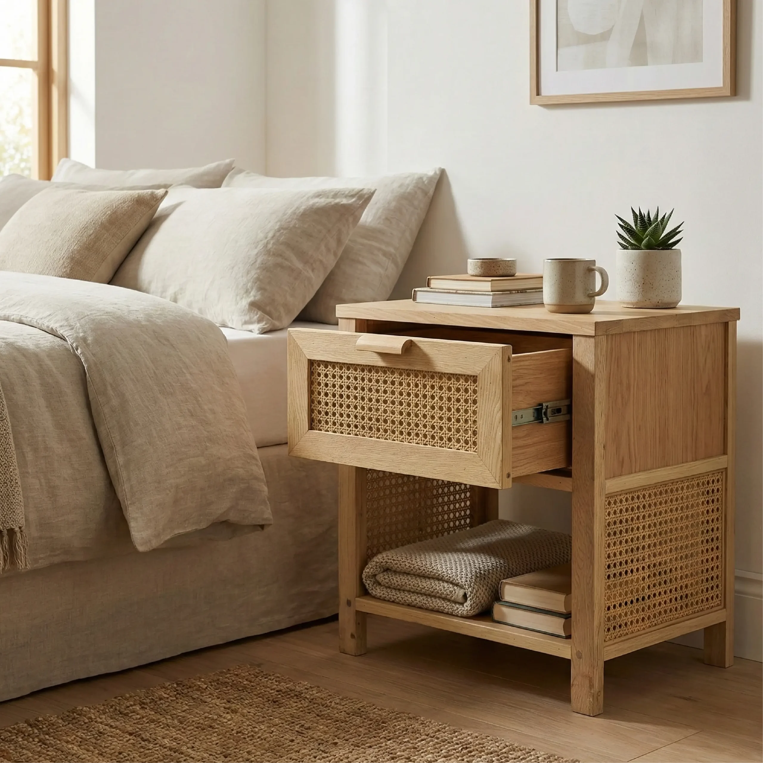 Storage: Features a spacious, cane-fronted drawer for concealed storage and an open lower deck for easy-access display.