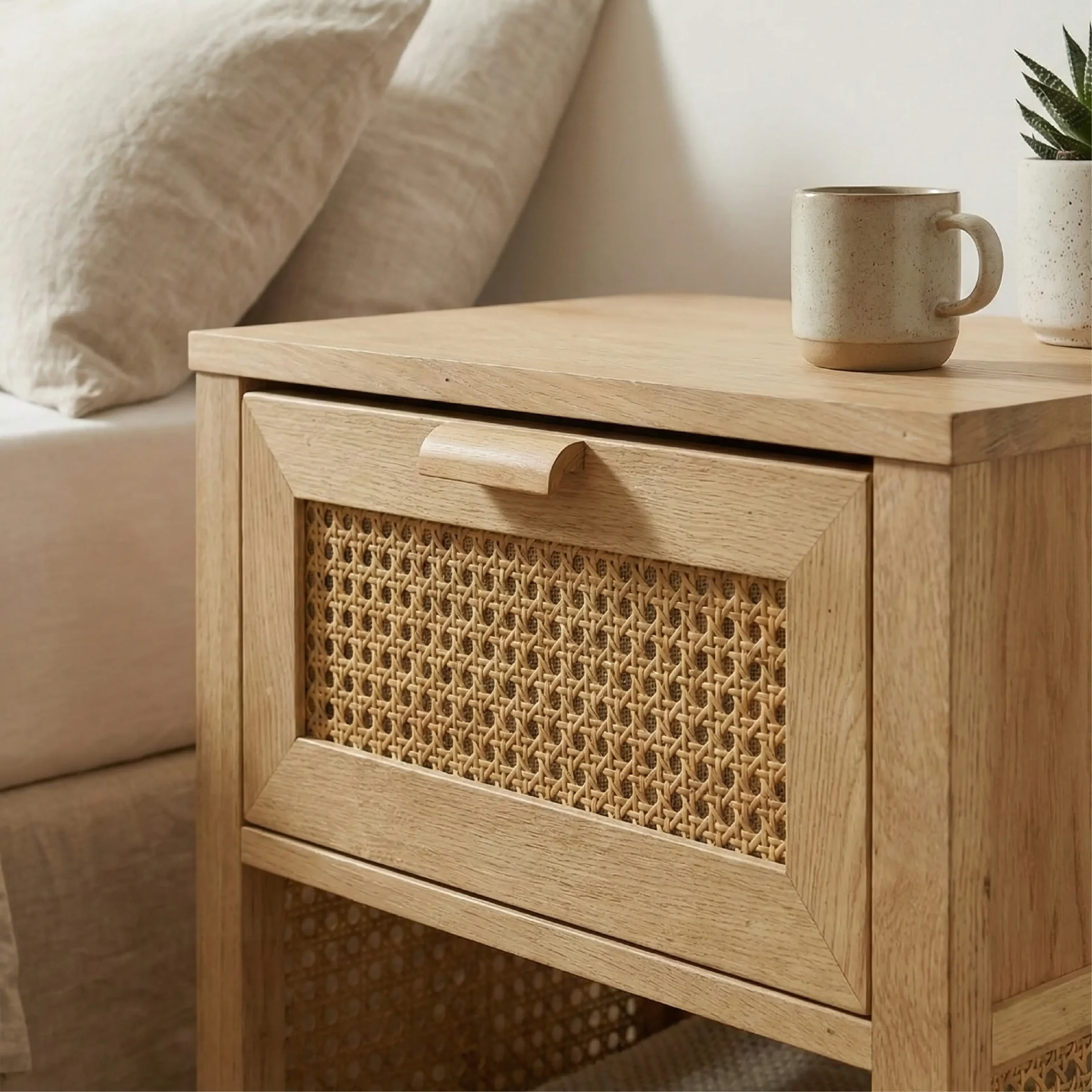 Bring a touch of organic warmth to your bedside or living space with The Cane-Drawer Accent Table. As a versatile staple in the Buena Casa catalog, this piece marries the enduring strength of solid Shesham wood with the breezy, textural appeal of traditional rattan. The clean-lined architectural frame houses a single, smooth-gliding drawer faced with hand-woven natural cane, providing the perfect hideaway for bedside essentials or living room remotes. An open lower shelf offers additional display space for your favorite reading materials, making this table as functional as it is beautiful.