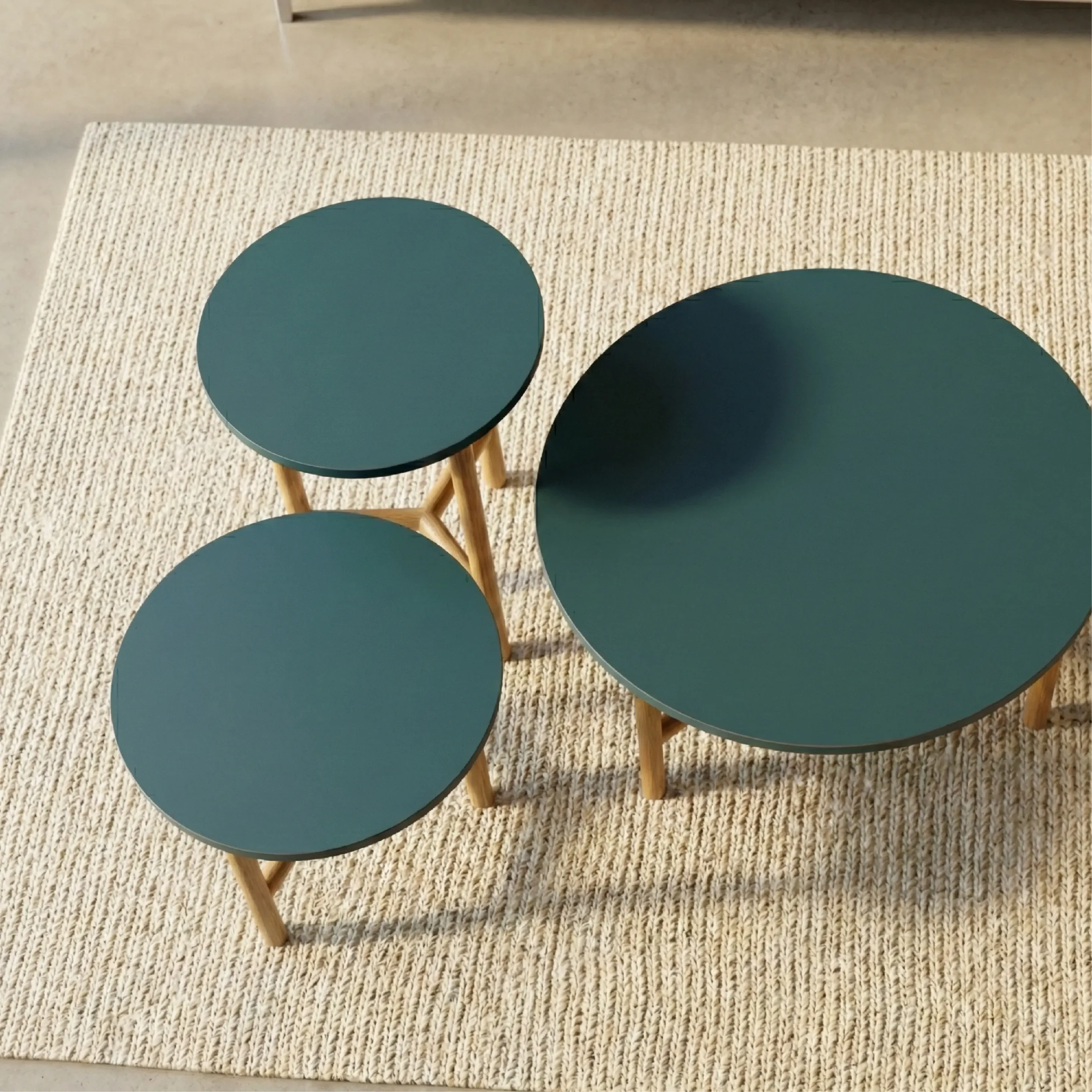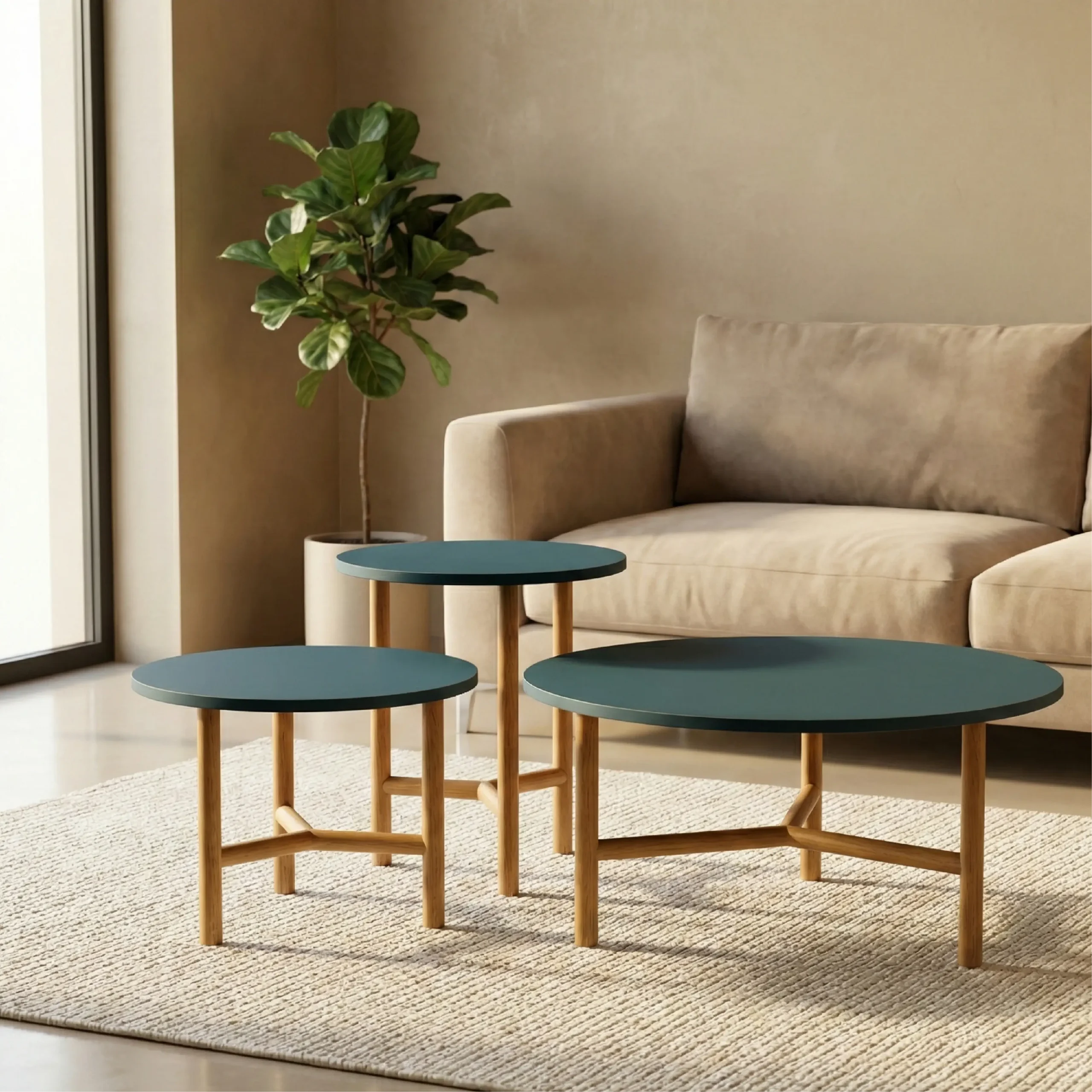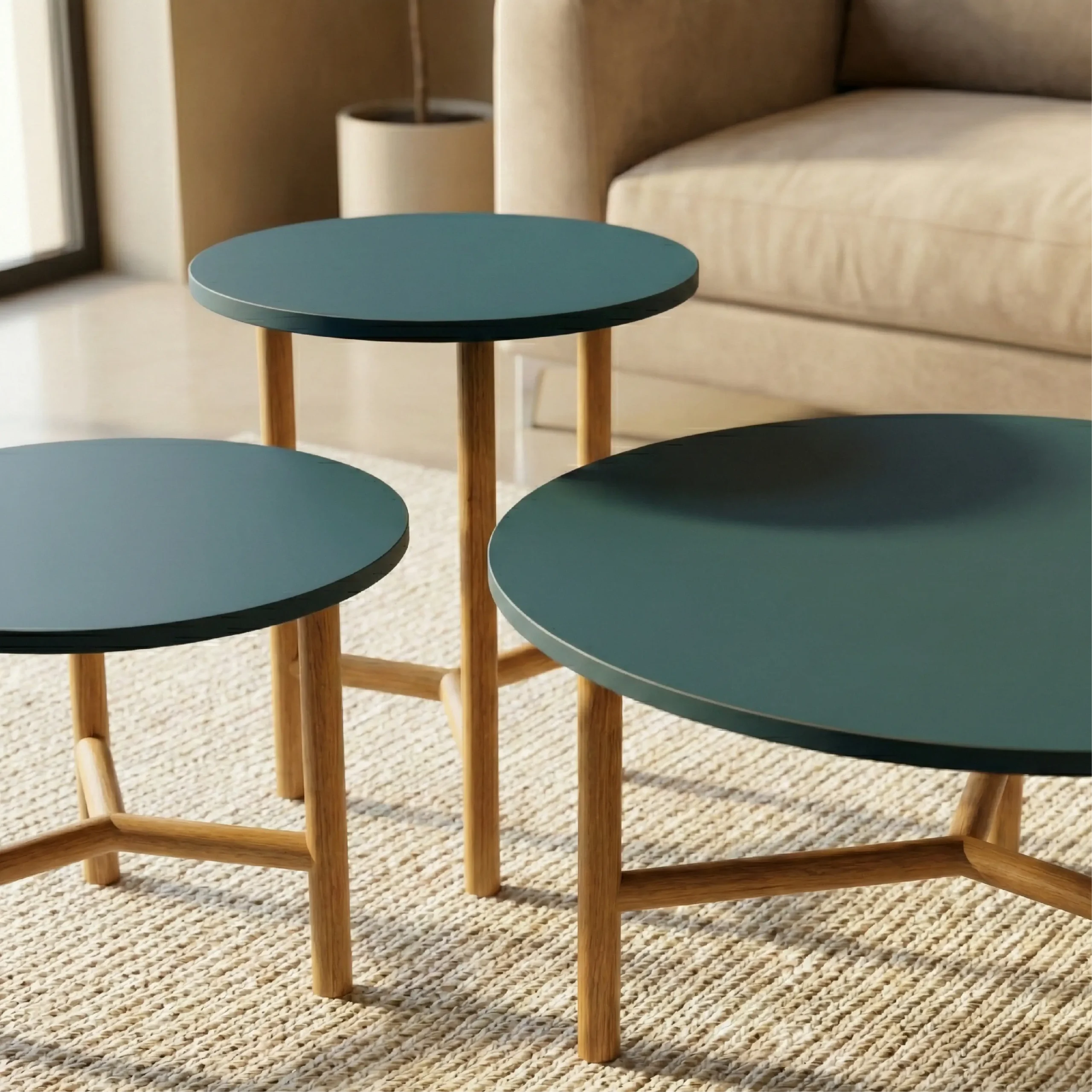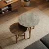 Dynamic Modularity: A two-piece set featuring a taller, overlapping companion table and a wider, low-profile primary table, allowing for endless spatial configurations.